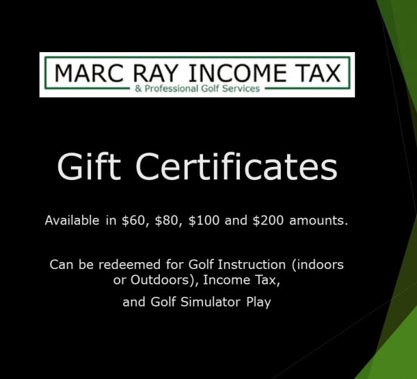 Gift Certificates will be emailed to the Purchaser and can be redeemed in the future for Income Tax Returns, Golf Lessons, or Simulator Time.